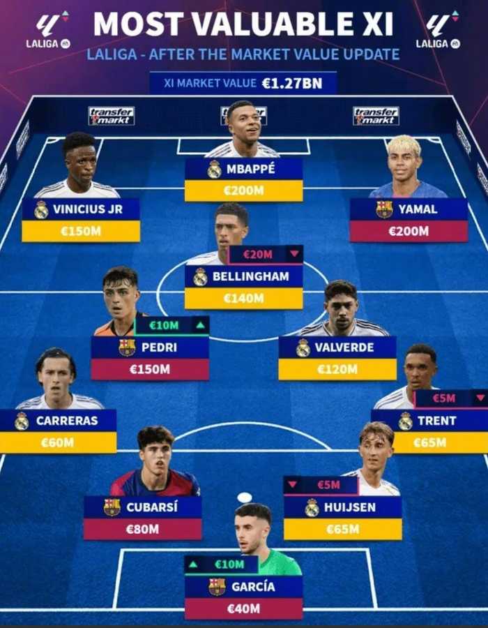 德转今日更新了西甲球员身价,并盘点了身价最高11人阵容,具体如下: